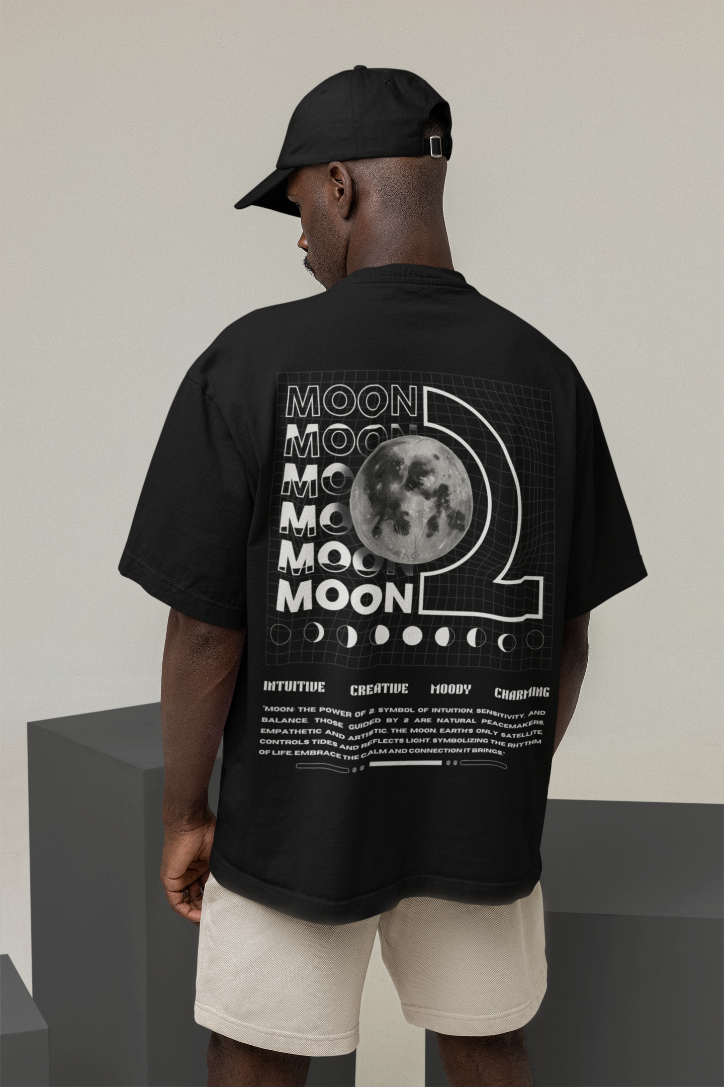 • Features a minimalist 3x5 inch front design and a bold 14x16 inch back artwork showcasing the Moon’s phases.