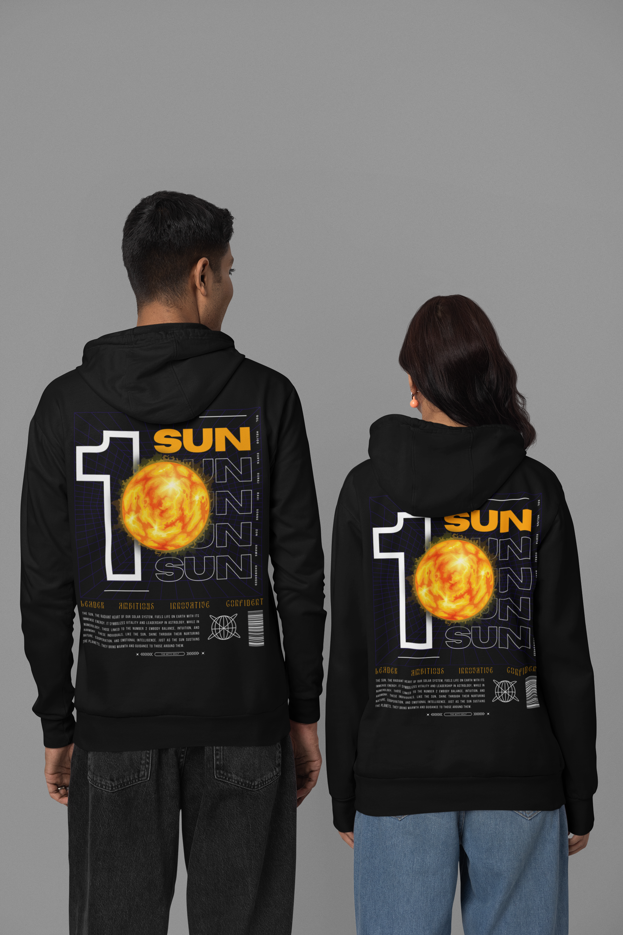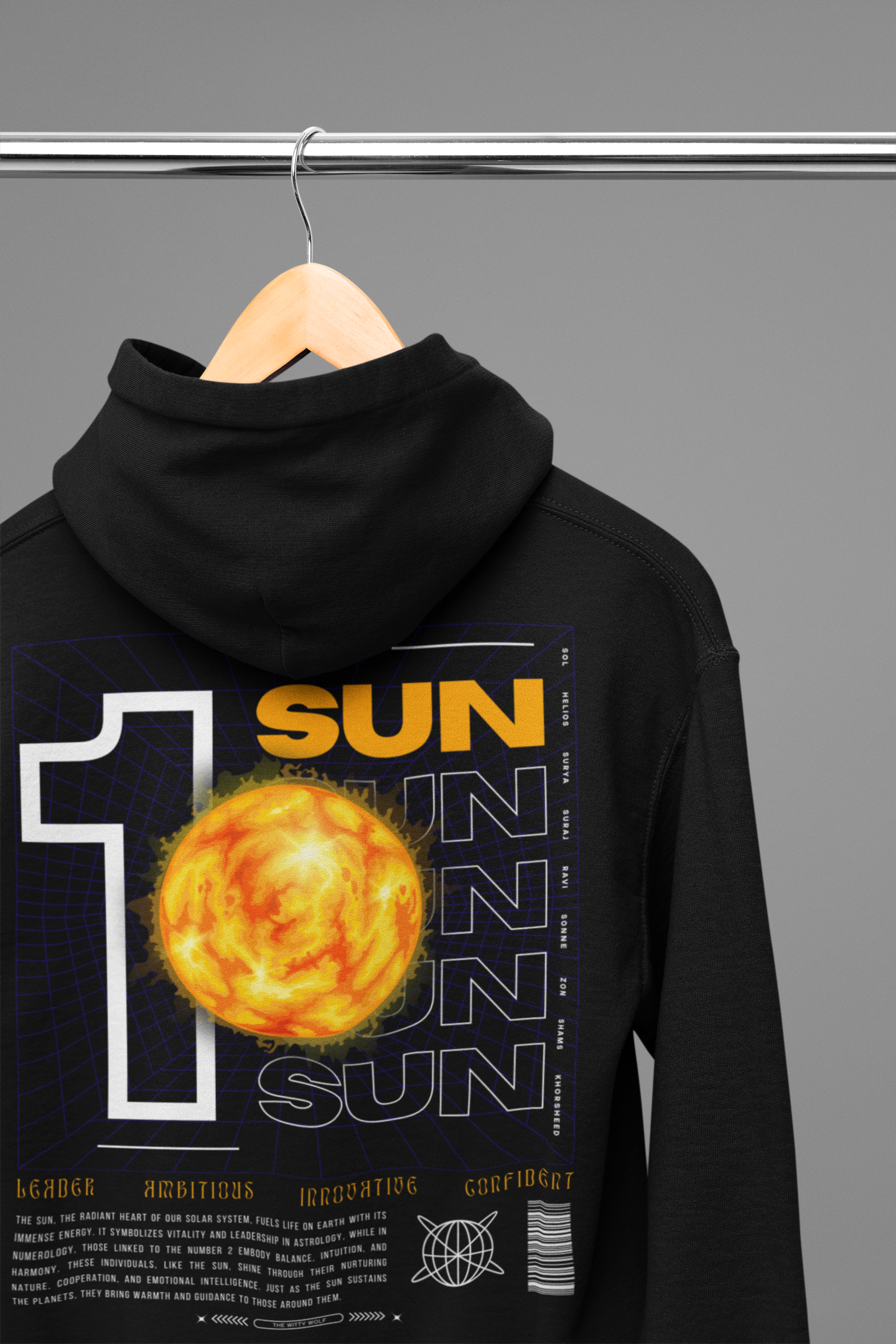 The design features a sleek 2x6 inch print on the front and a bold 15x17 inch graphic on the back, embodying the commanding energy of the Sun and its connection to leadership and ambition. In numerology, number 1 is synonymous with pioneers, visionaries, and those who dare to stand out. Paired with the Sun’s astronomical significance as the life-giving star at the center of our solar system, this hoodie celebrates your ability to light up any room and inspire others.