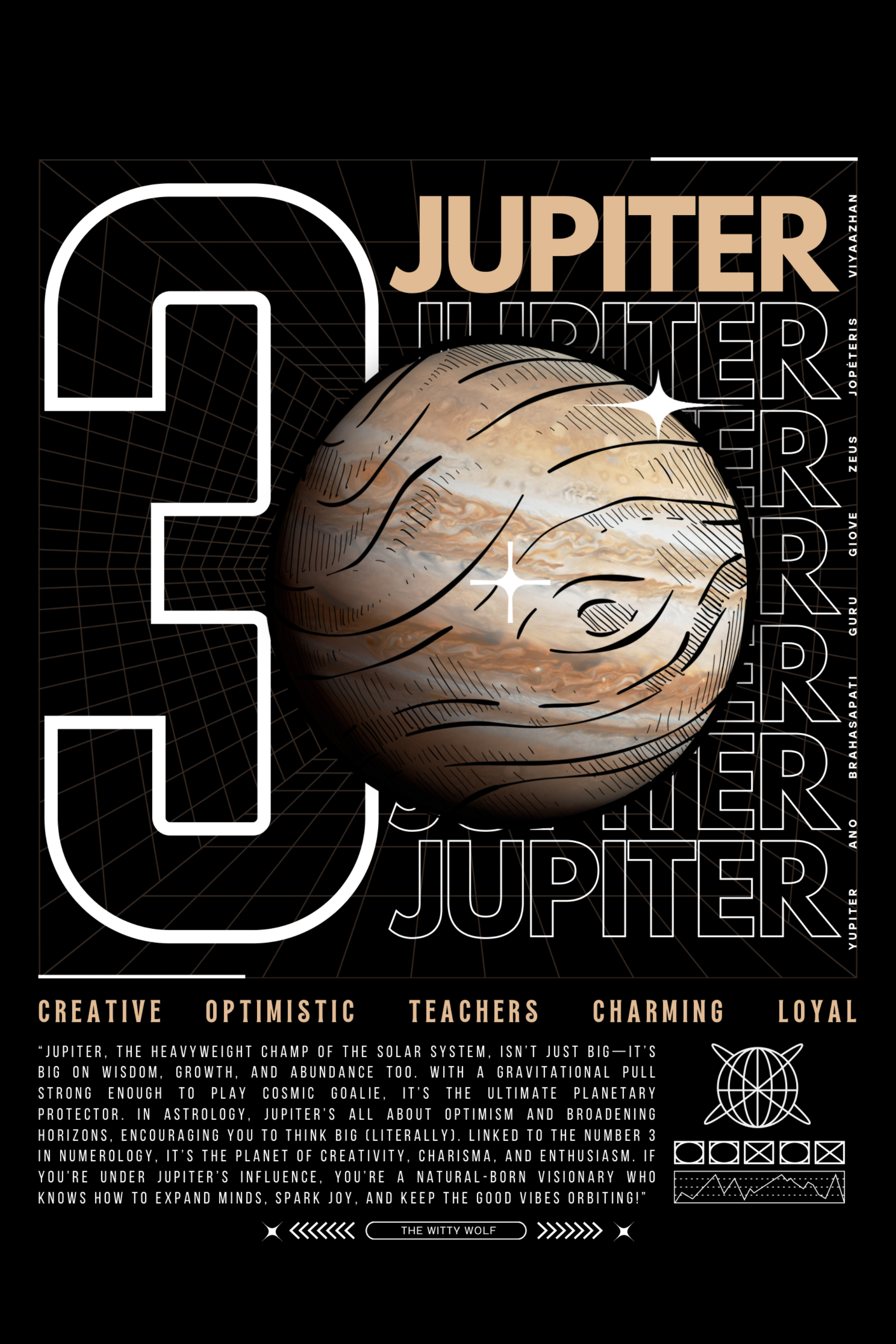 With a 3x7 inch front print and a bold 14x16 inch back design, this Tshirt pays tribute to Numerology No. 3 personalities—optimistic powerhouses with creativity that’s out of this world. In numerology, 3s are the life of the party, natural storytellers, and magnetic dreamers who turn every moment into an adventure. Add Jupiter, the solar system’s largest planet, as your cosmic sponsor, and you’ve got the ultimate combo of growth, wisdom, and interstellar vibes.